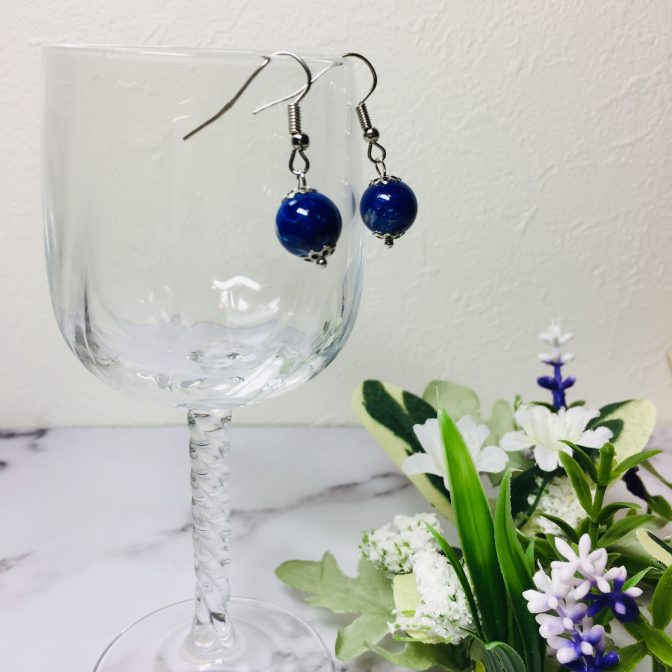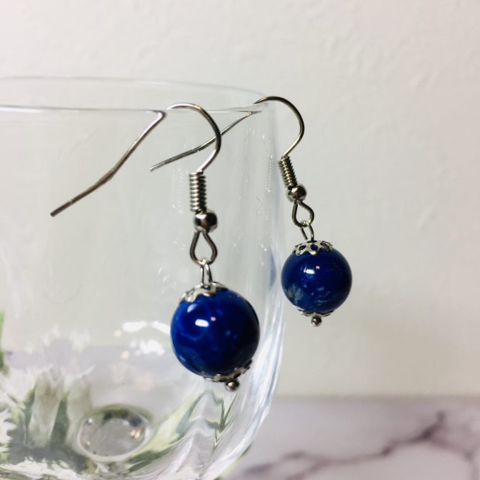 耳元で揺れる、深みのある青色のラピスラズリが素敵です。