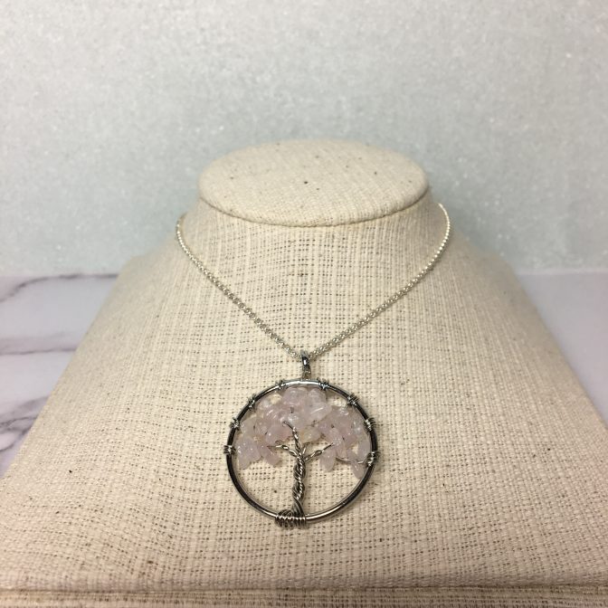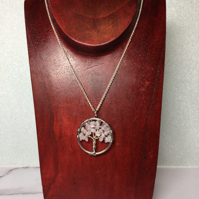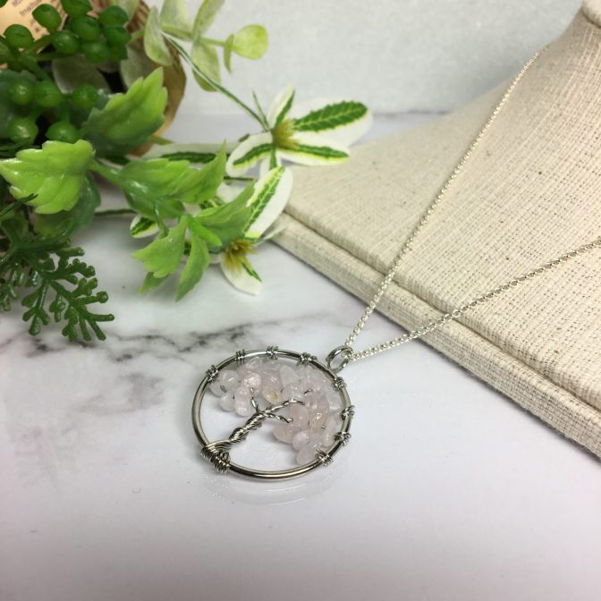 淡く優しいピンク色の小さなローズクォーツが花満開の木にも見えて、とても可愛い天然石アクセサリーです。