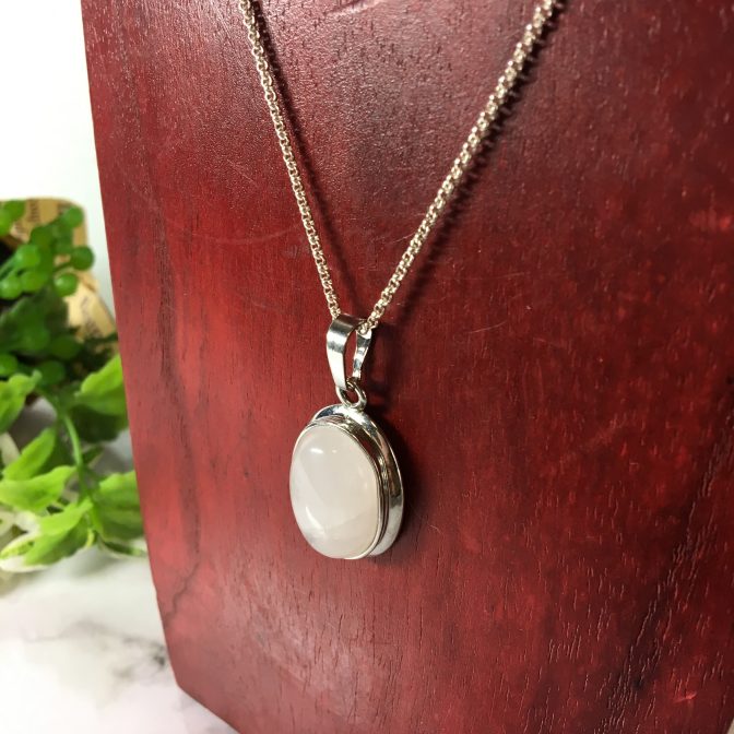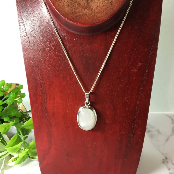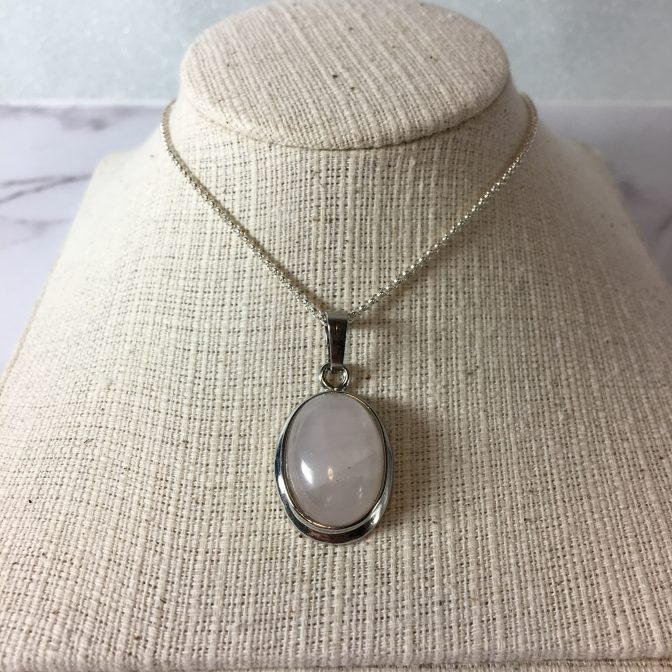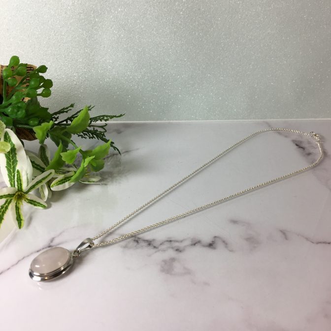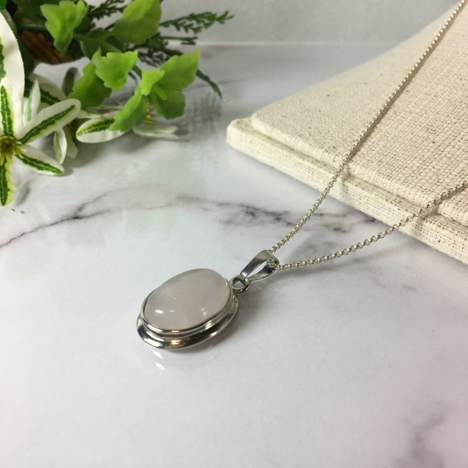 楕円形のシンプルなデザインのローズクォーツ石のペンダントトップ。
